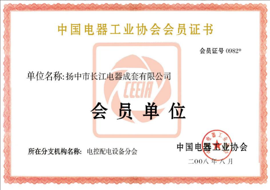中國電器工業協會會員證書