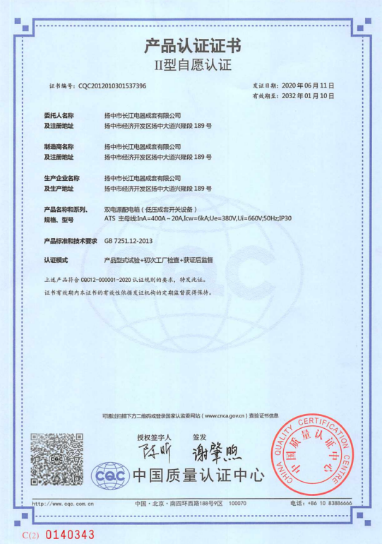 雙電源配電箱(低壓成套開關設備)ATS-400A-20A-產品認證證書