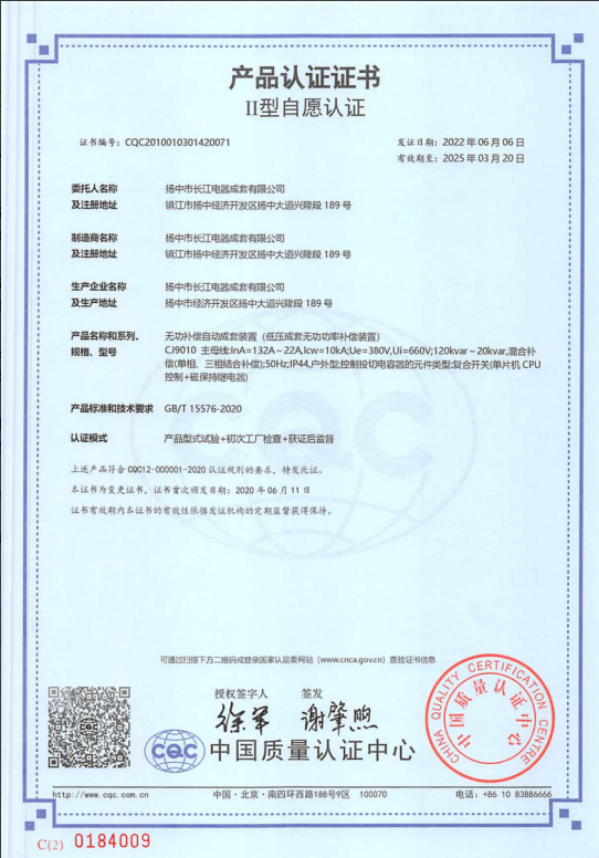 無功補償自動成套裝置(低壓成套無功功率補償裝置)CJ9010-132A -22A -產品認證證書