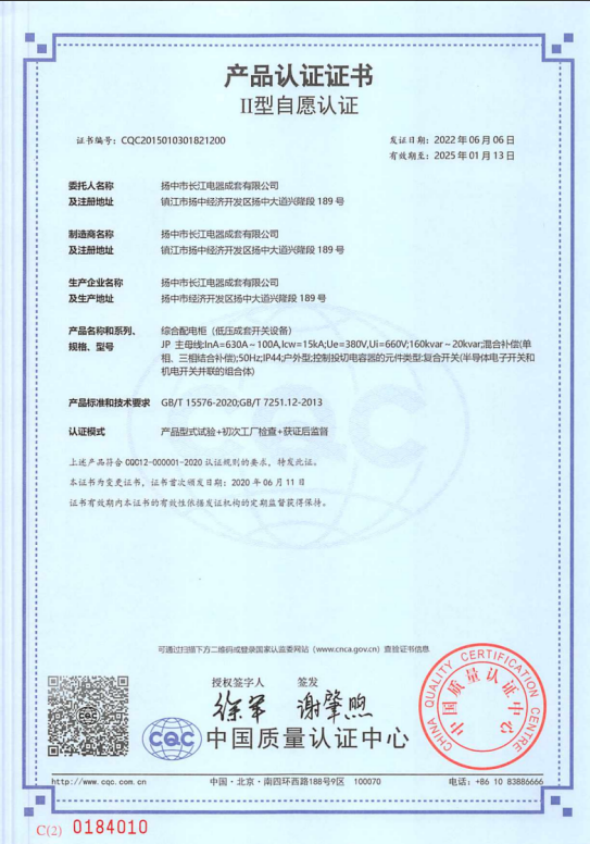 綜合配電柜(低壓成套開關(guān)設(shè)備)JP630A-100A-產(chǎn)品認(rèn)證證書