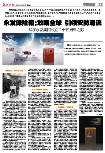 曾經的民辦村企到如今保險箱龍頭企業,今年寧波永發集團迎來了它25歲的生日。寧波永發集團是一家研制、生產、銷售防盜、防火保險柜、智能槍械柜、銀行金庫門、智能防盜門及智能鎖具為主導產品的科技型企業,是目前中國最大的保險箱生產企業及創匯企業之一。