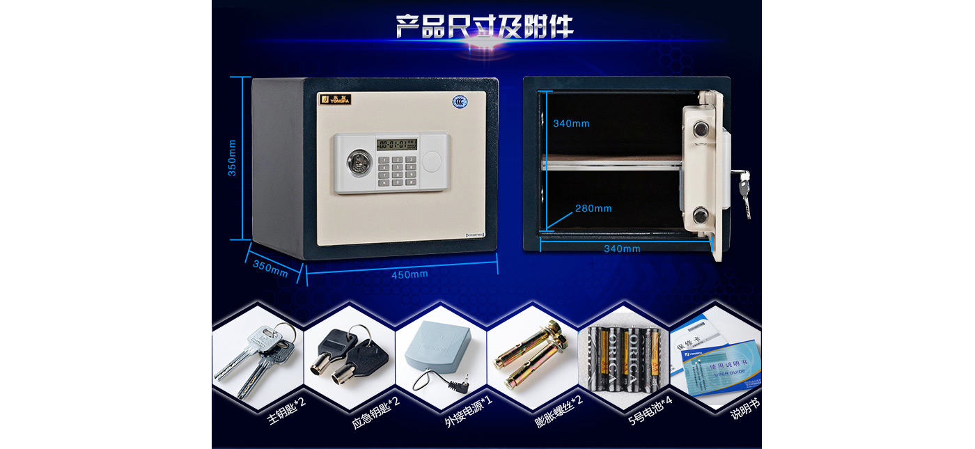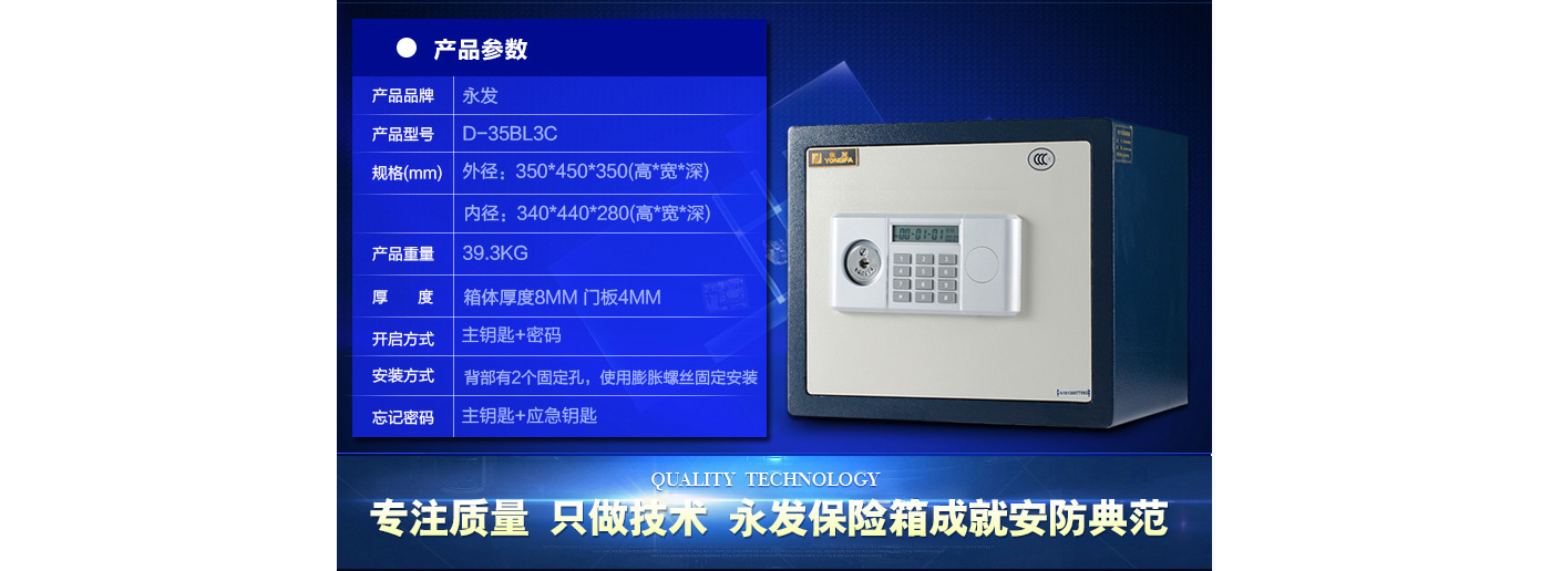 永發(fā)經(jīng)典電子系列3C認(rèn)證保險(xiǎn)箱D-35BL3C尺寸說明:350高*450寬*350深mm 重量:39kg