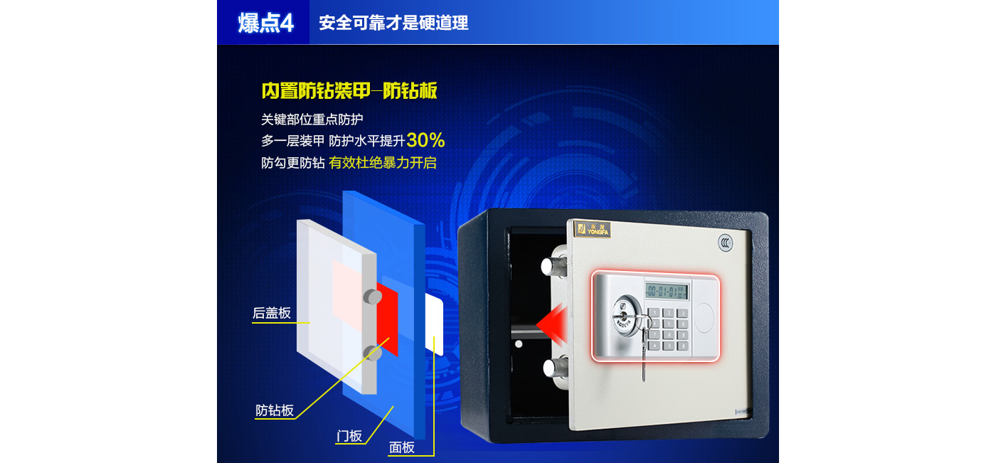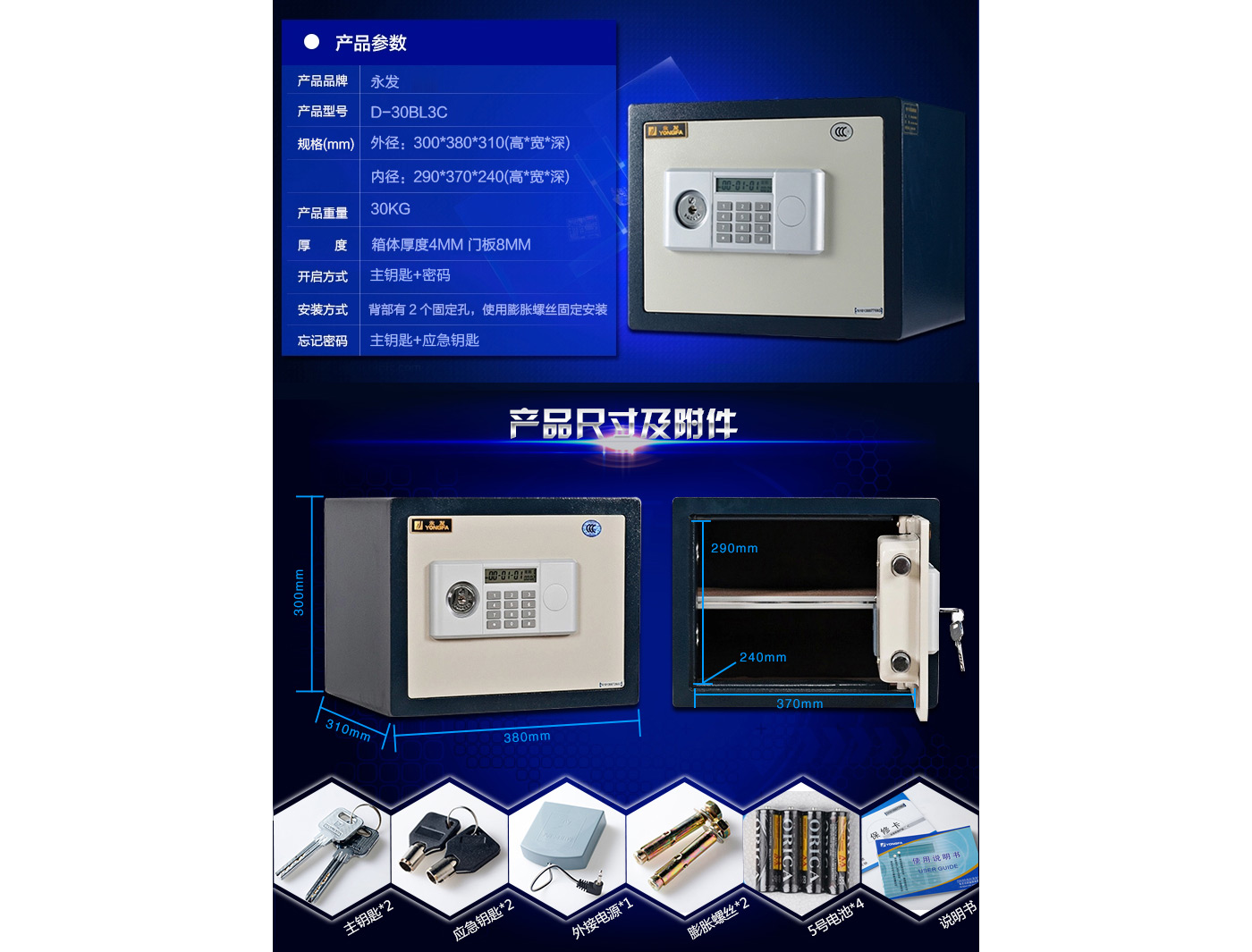 永發(fā)經(jīng)典電子系列3C認(rèn)證保險(xiǎn)箱D-30BL3C尺寸說(shuō)明:300高*380寬*310深mm 重量:30kg