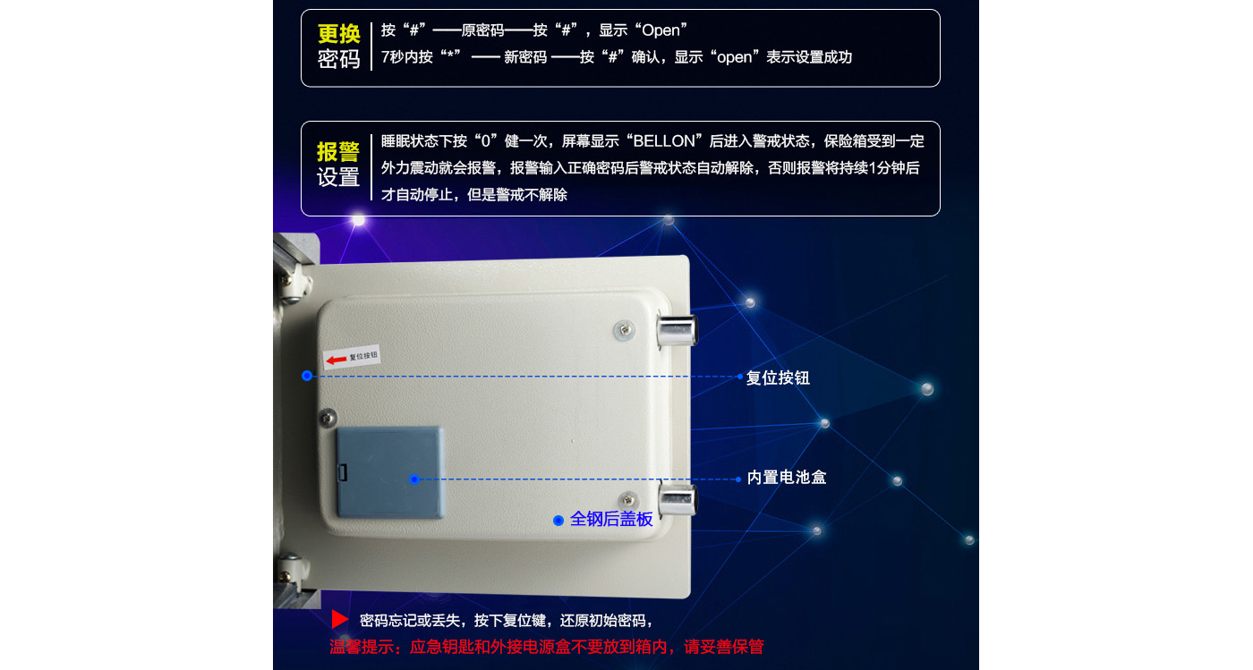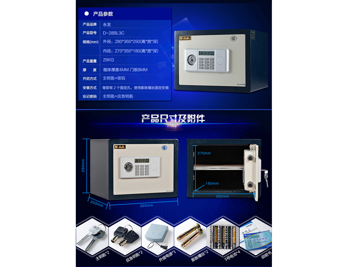 永發(fā)經(jīng)典電子系列3C認(rèn)證保險(xiǎn)箱D-28BL3C尺寸說明:280高*360寬*250深mm 重量:25kg