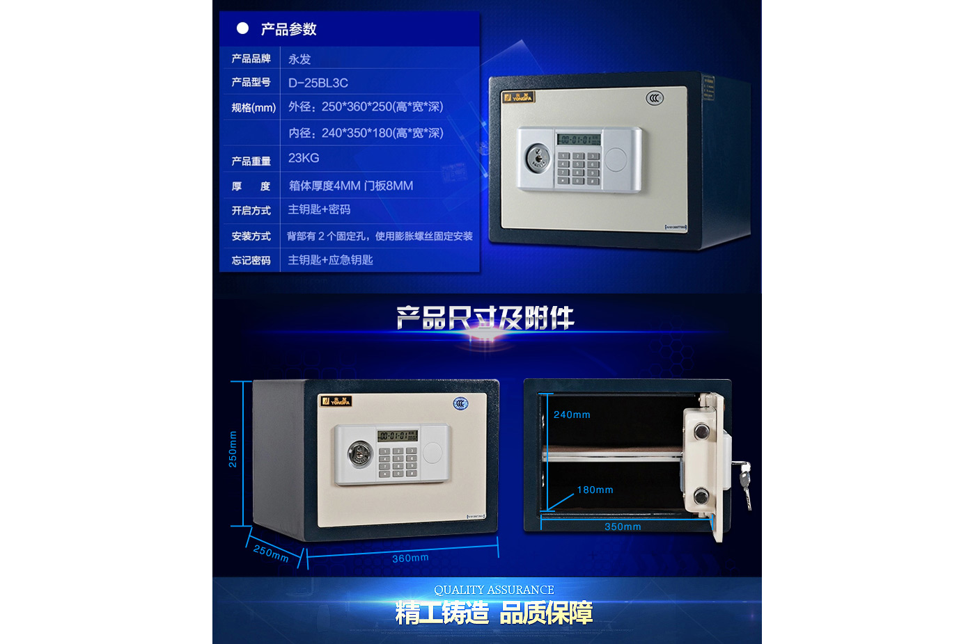 永發(fā)經(jīng)典電子系列3C認證保險箱D-25BL3C尺寸說明:250高*350寬*250深mm(含底座) 重量:23kg