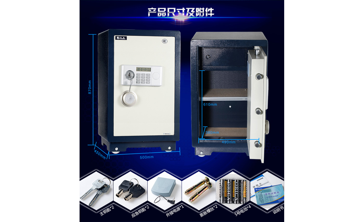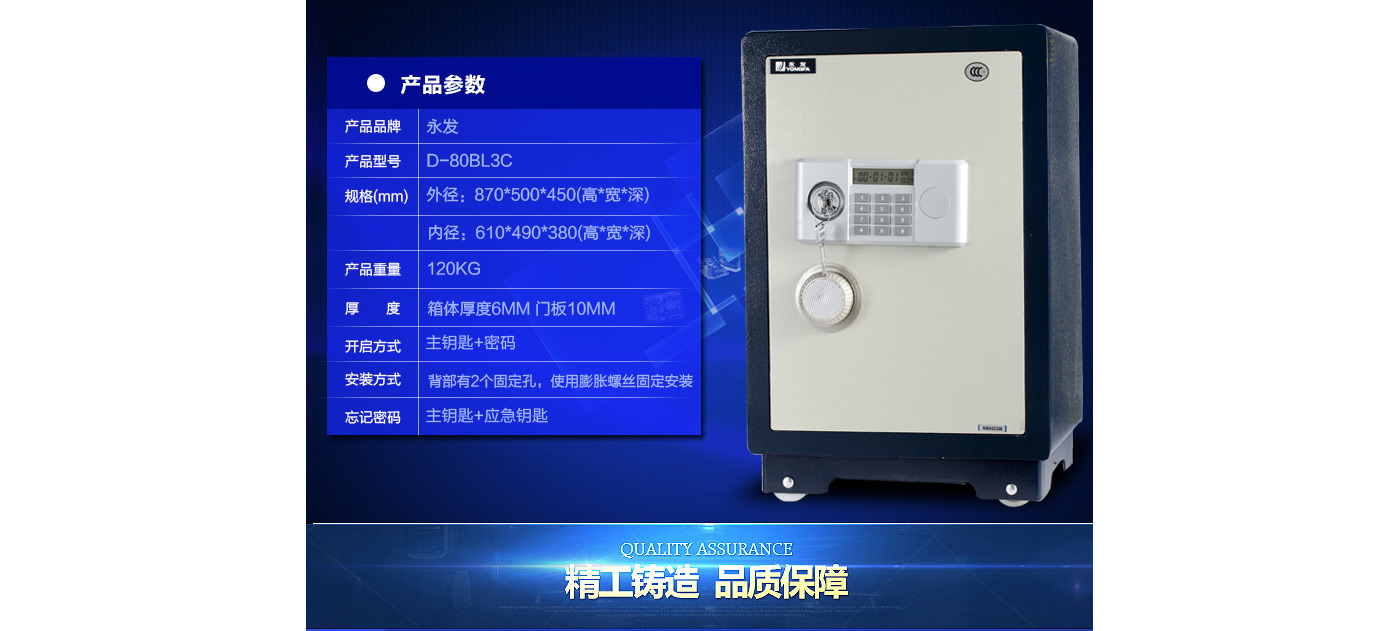 永發(fā)經典電子系列3C認證保險箱D-80BL3C尺寸說明:870高*500寬*450深mm(含底座) 重量:120kg