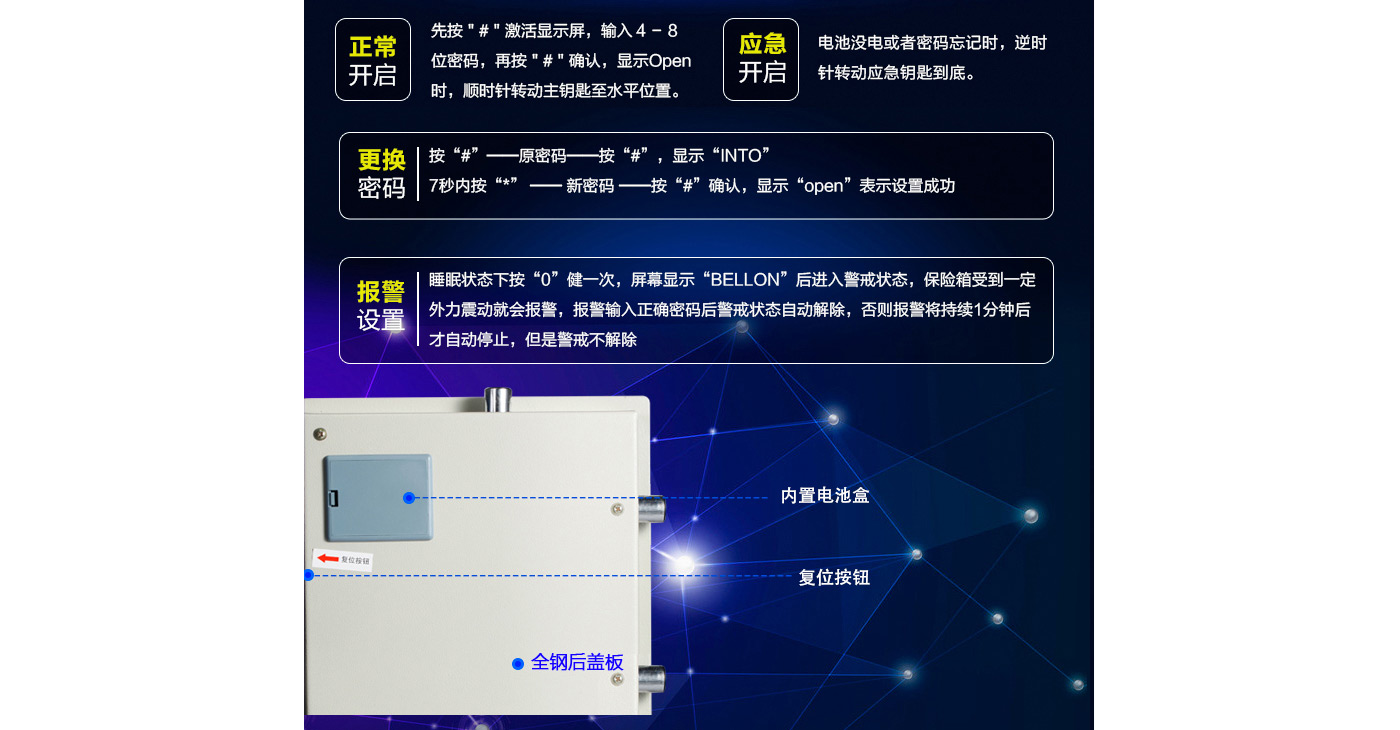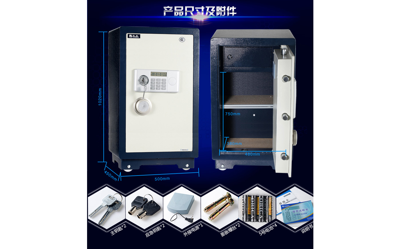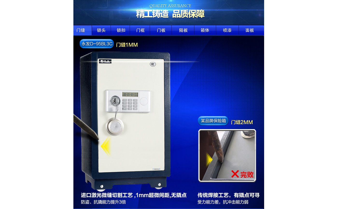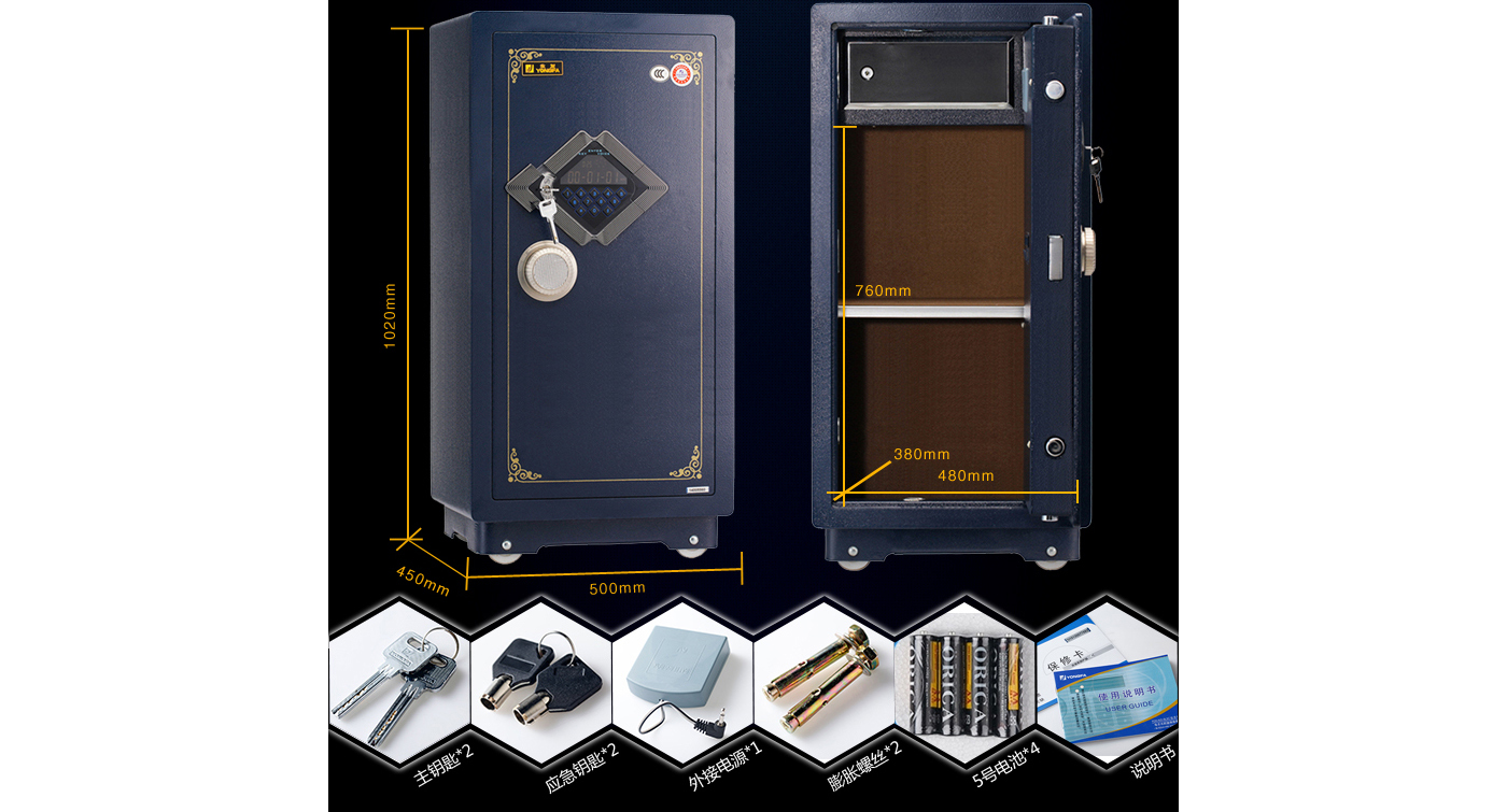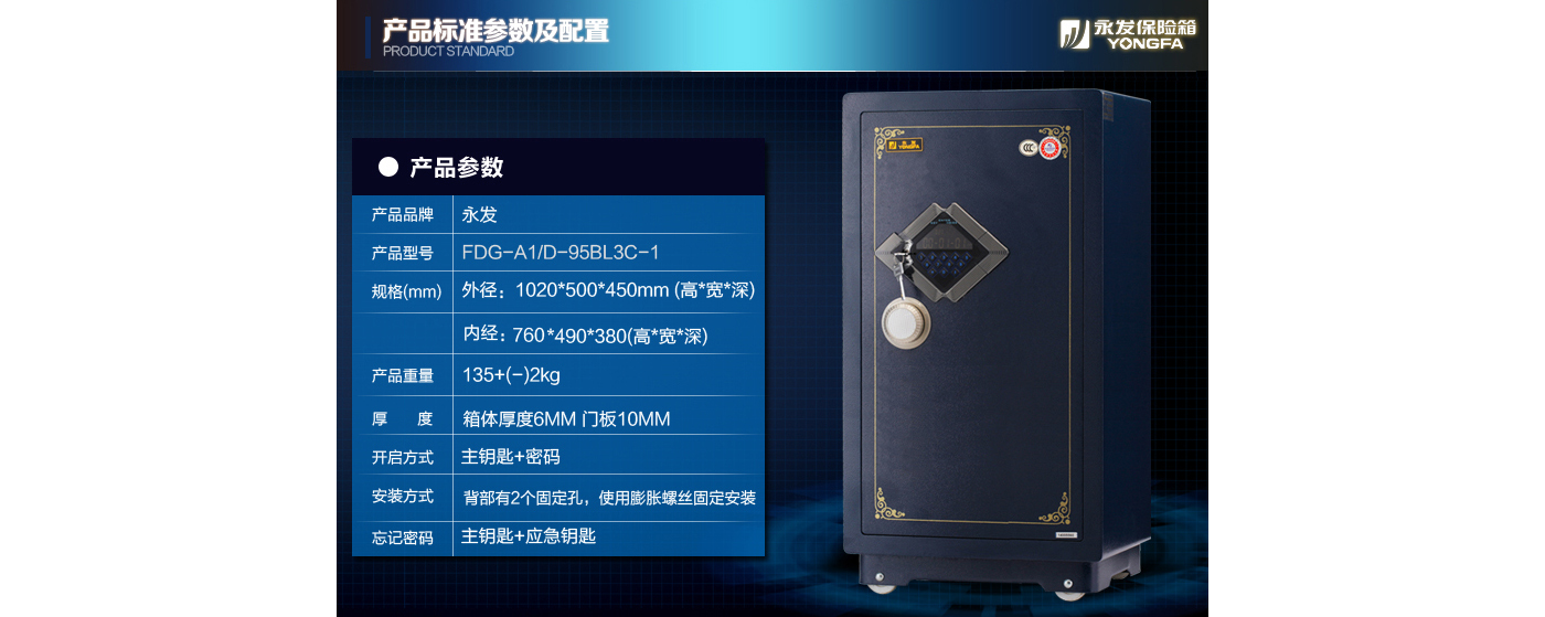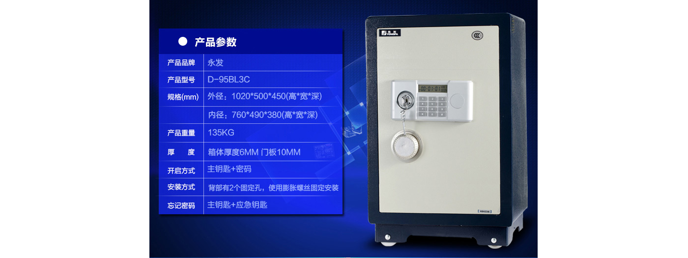 永發(fā)經(jīng)典電子系列3C認(rèn)證保險(xiǎn)箱D-95BL3C尺寸說明:1020高*500寬*450深mm(含底座) 重量:135kg