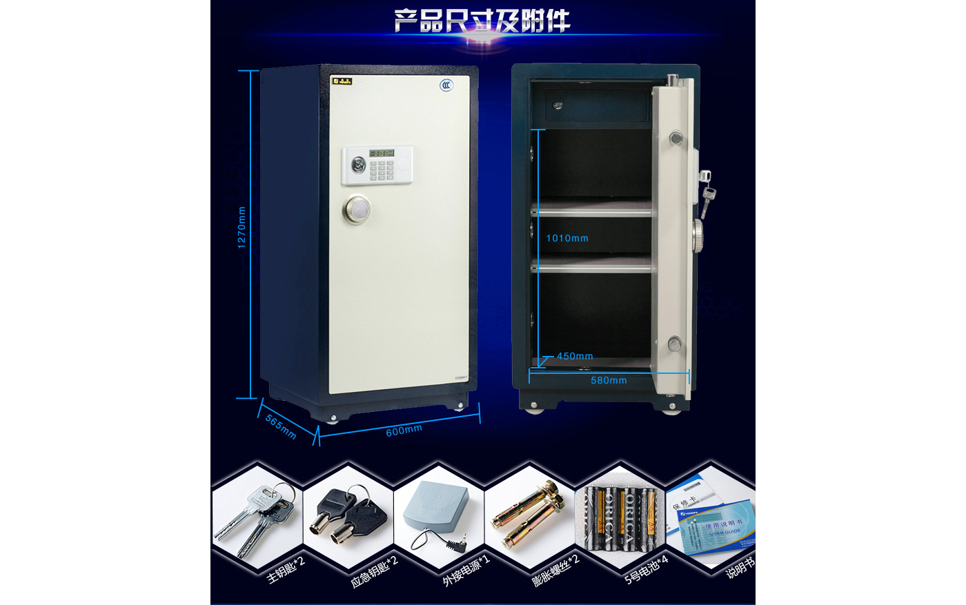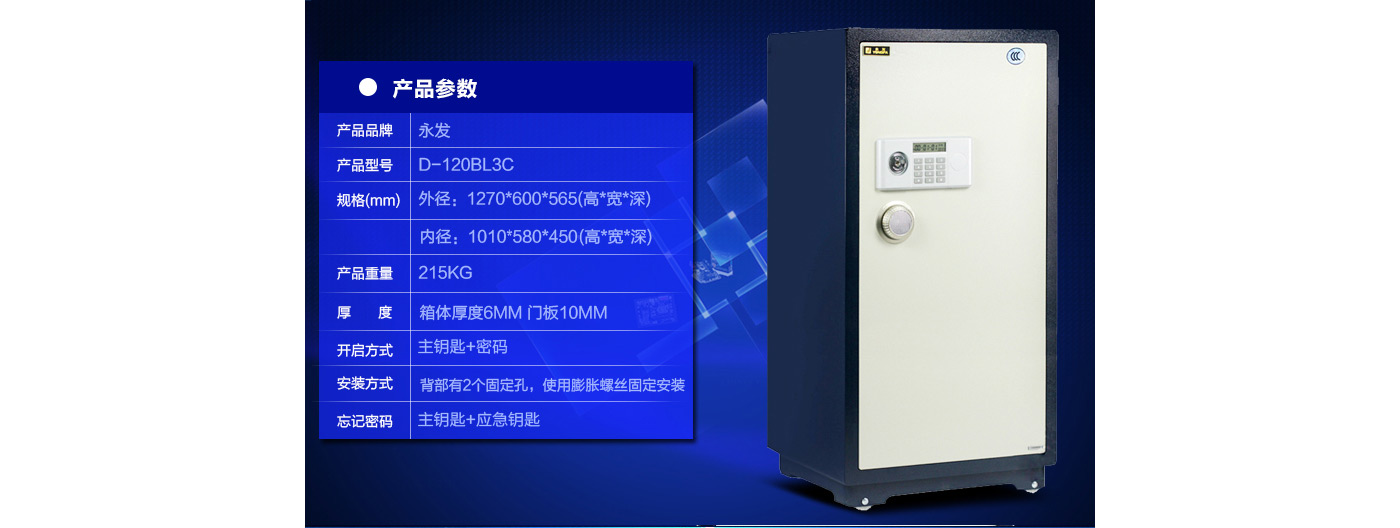 永發(fā)經(jīng)典電子系列3C認證保險箱D-120BL3C尺寸說明:1270高*600寬*565深mm(含底座) 重量:215kg