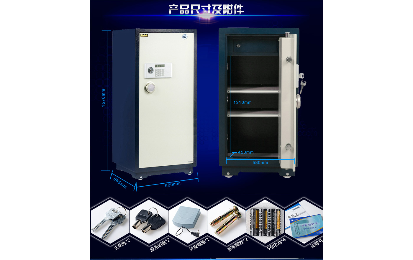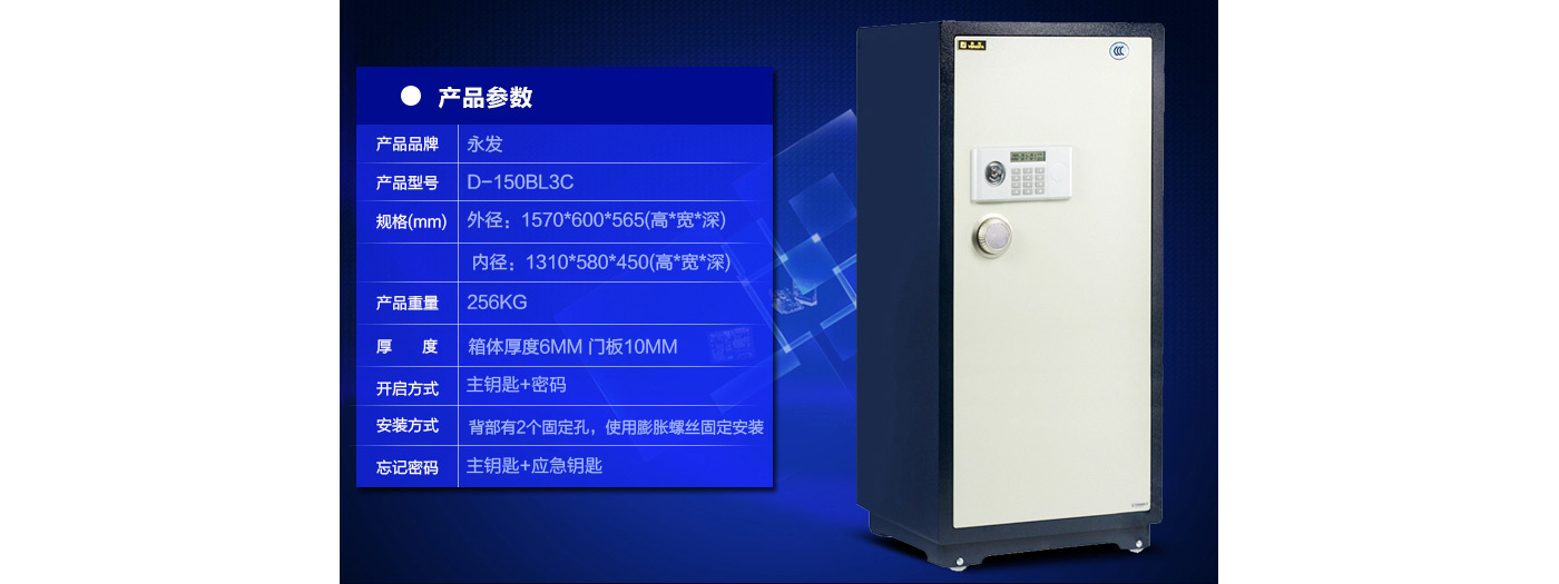 永發(fā)經(jīng)典電子系列3C認(rèn)證保險箱D-150BL3C尺寸說明:1570高*600寬*565深mm(含底座) 重量:256kg