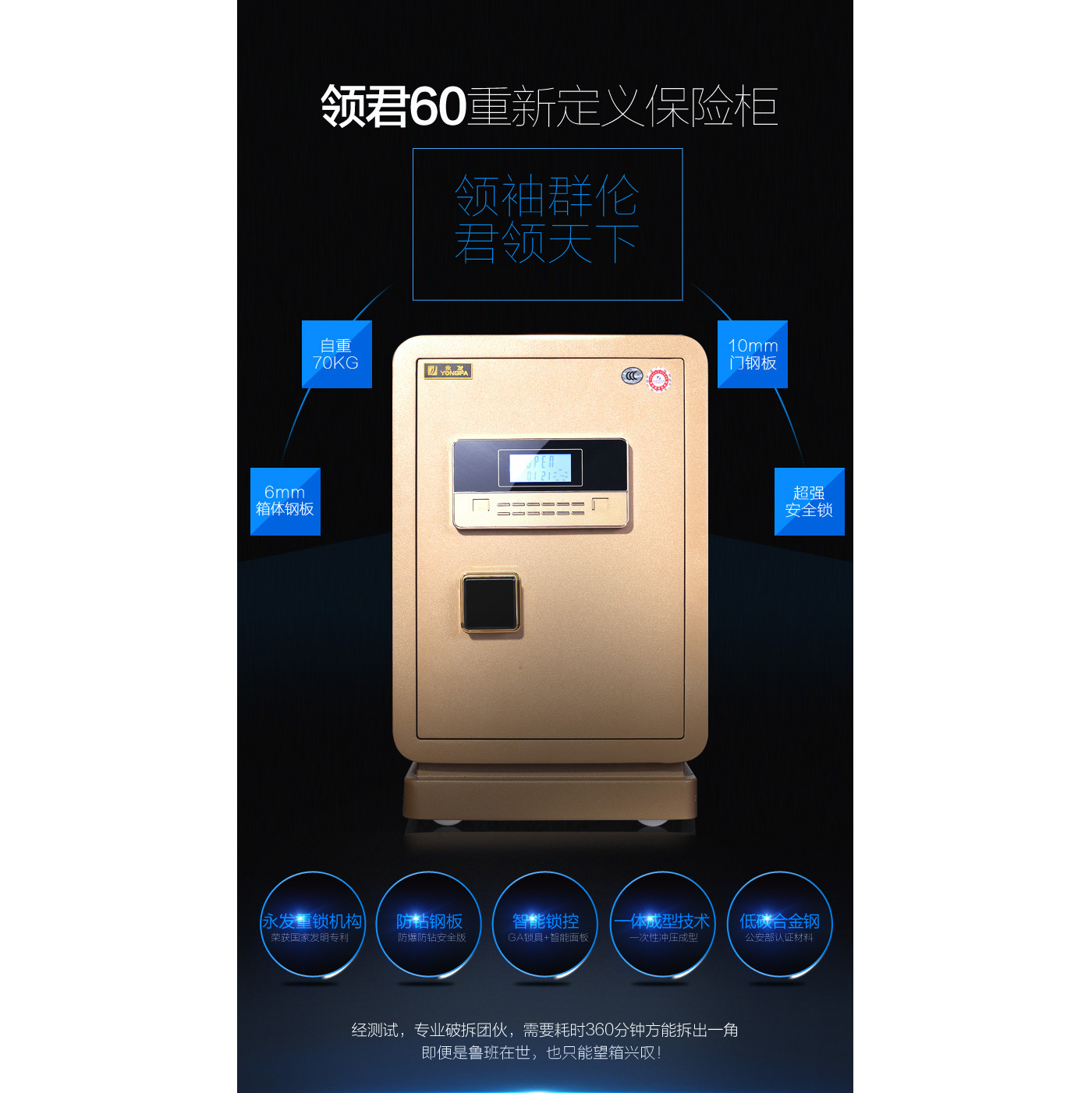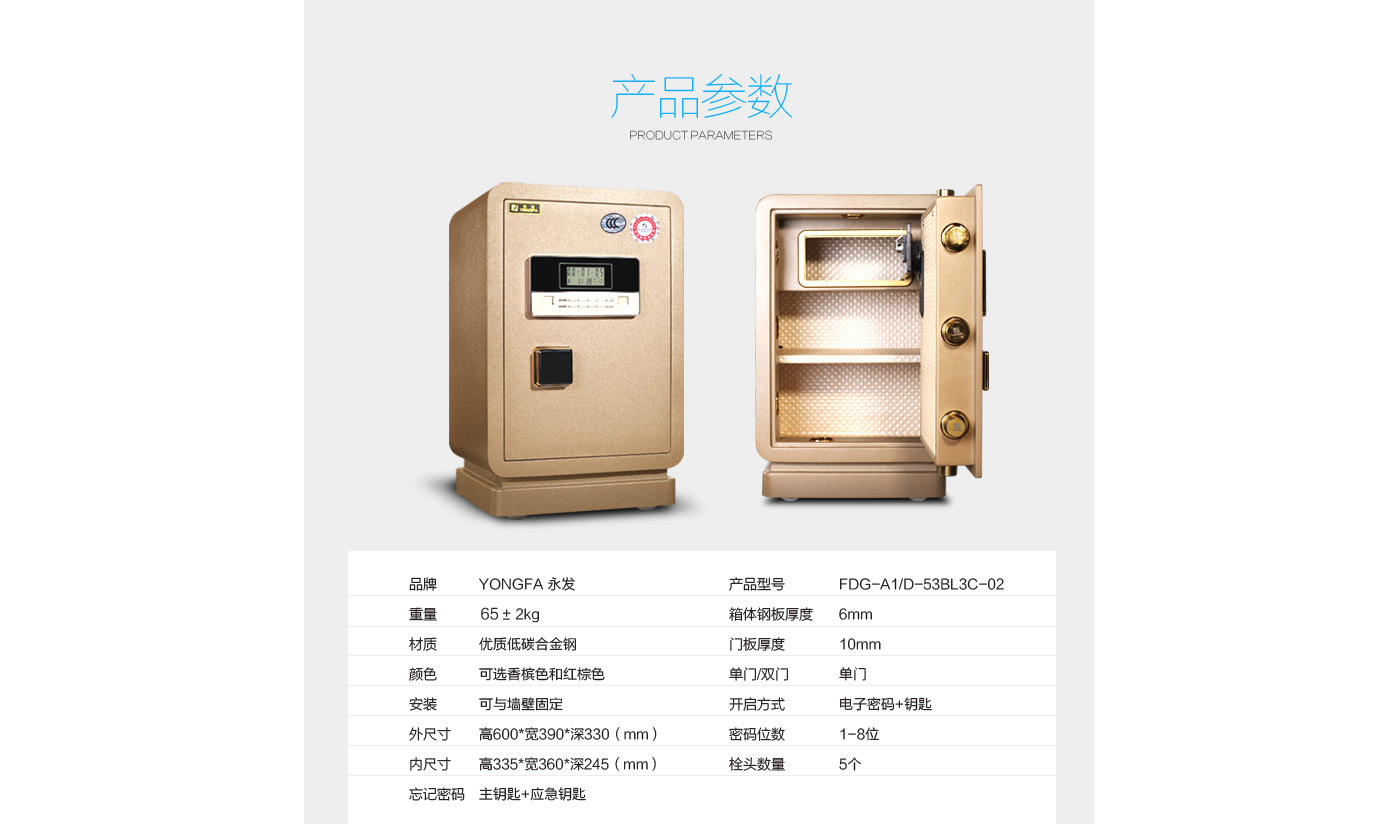 永發(fā)領(lǐng)君電子式保險箱D-53BL3C-02尺寸說明:600高*390寬*330深mm(含底座) 重量:69kg