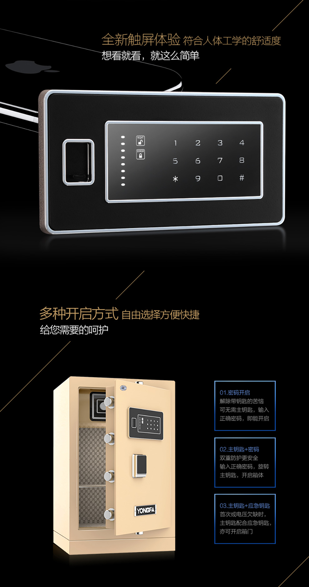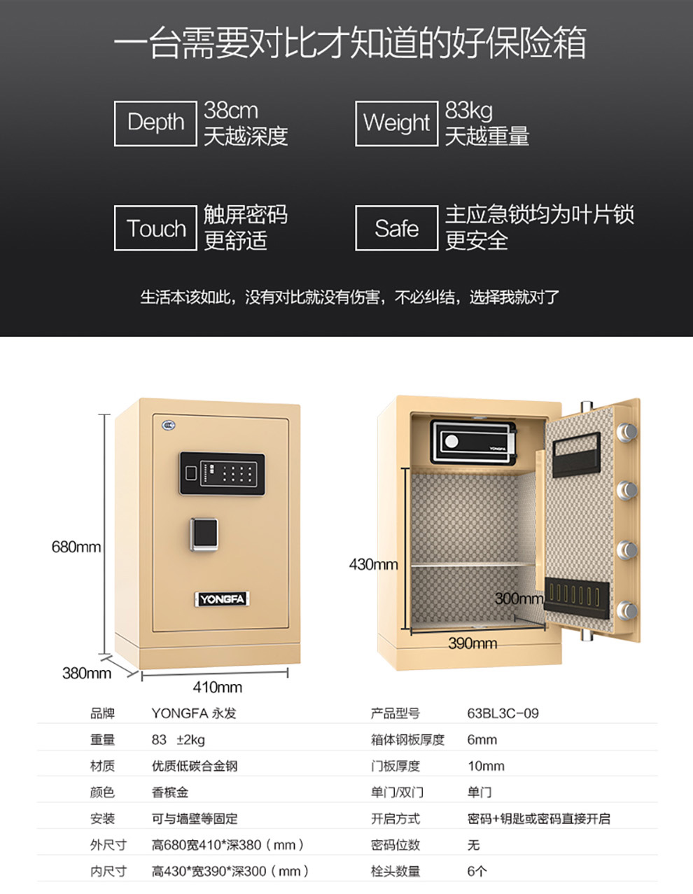 永發新品智瑞系列3C認證電子式保險柜63BL3C-09尺寸說明:700高*430寬*380深mm(含底座) 重量:93kg