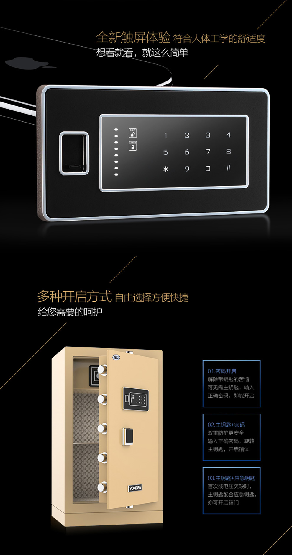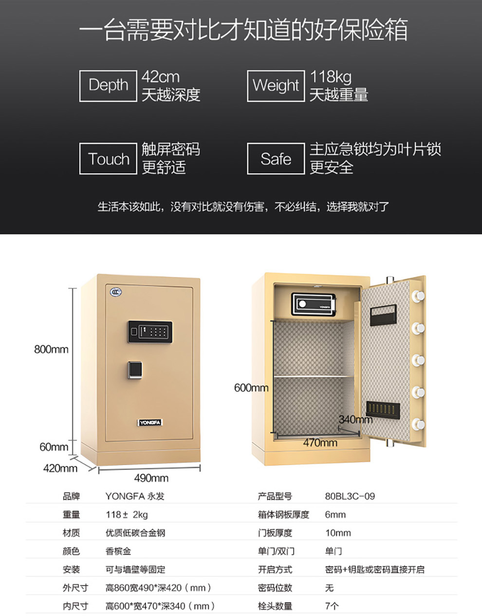永發(fā)新品智瑞系列3C認(rèn)證電子式保險(xiǎn)柜80BL3C-09尺寸說(shuō)明:860高*490寬*420深mm(含底座) 重量:118kg