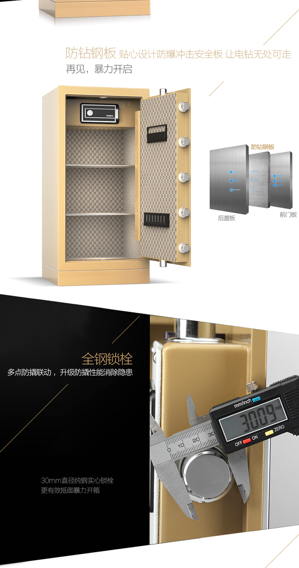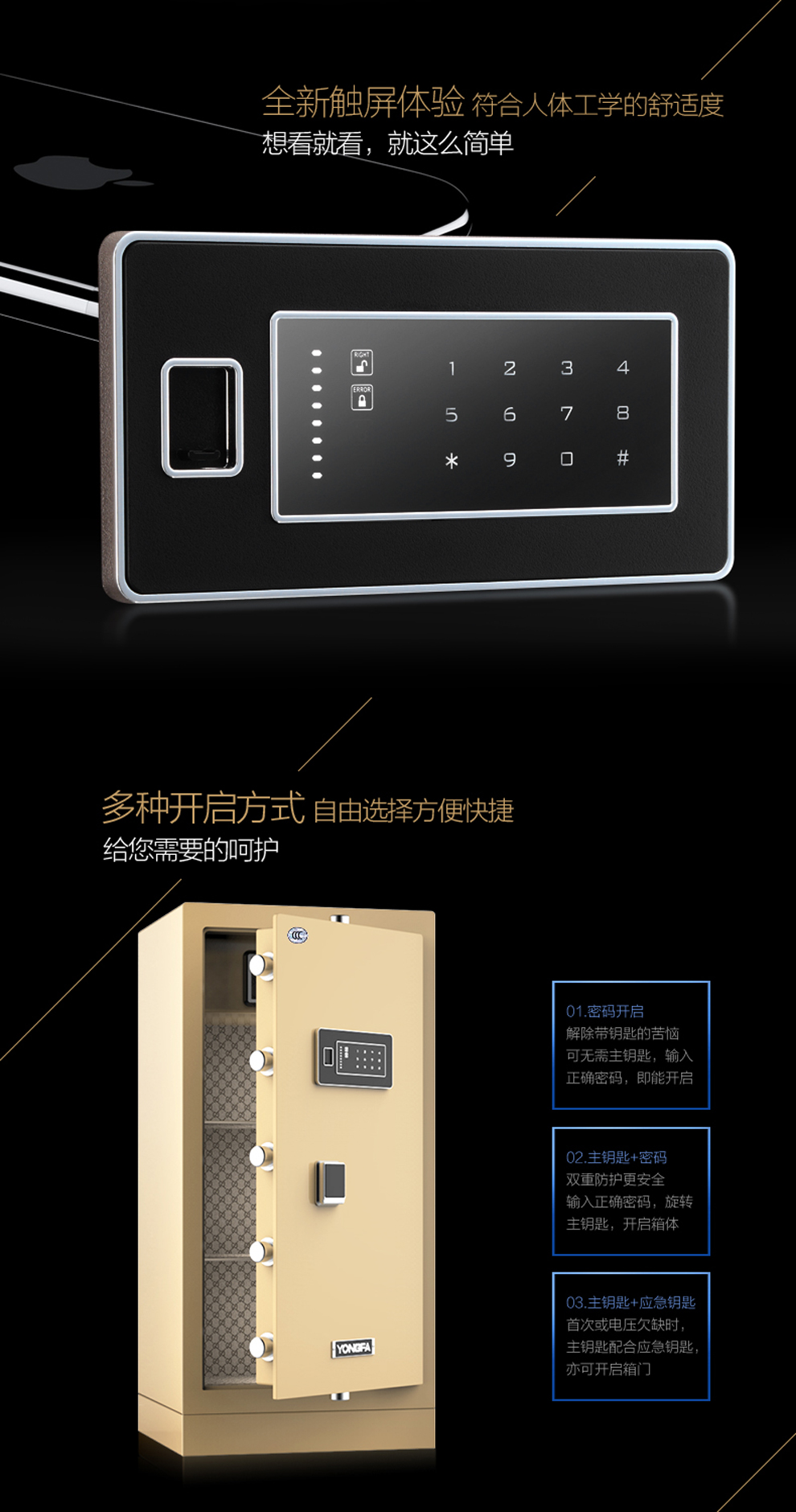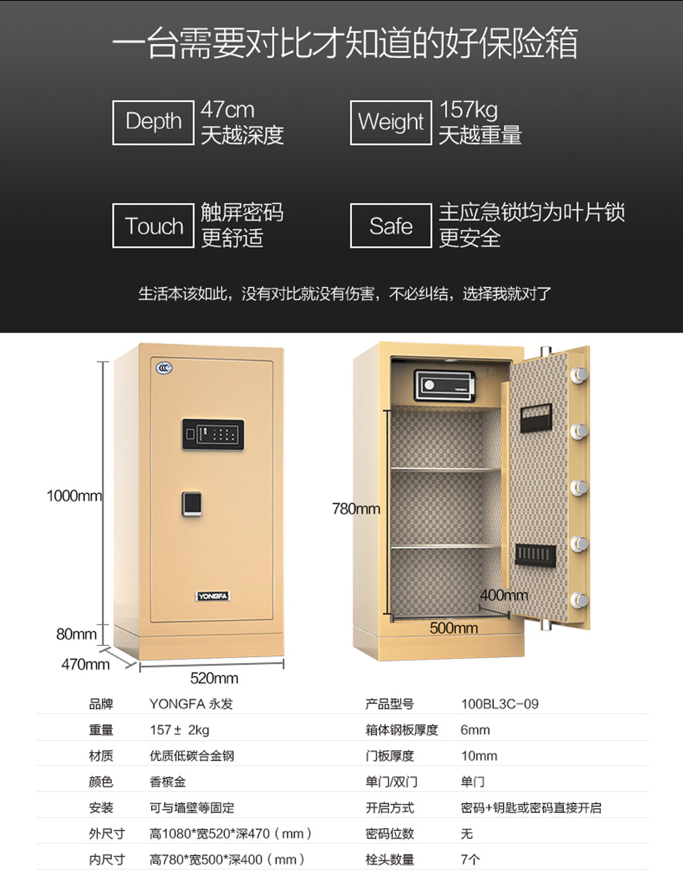 永發(fā)新品智瑞系列3C認(rèn)證電子式保險(xiǎn)柜100BL3C-09尺寸說(shuō)明:1060高*560寬*470深mm(含底座) 重量:164kg