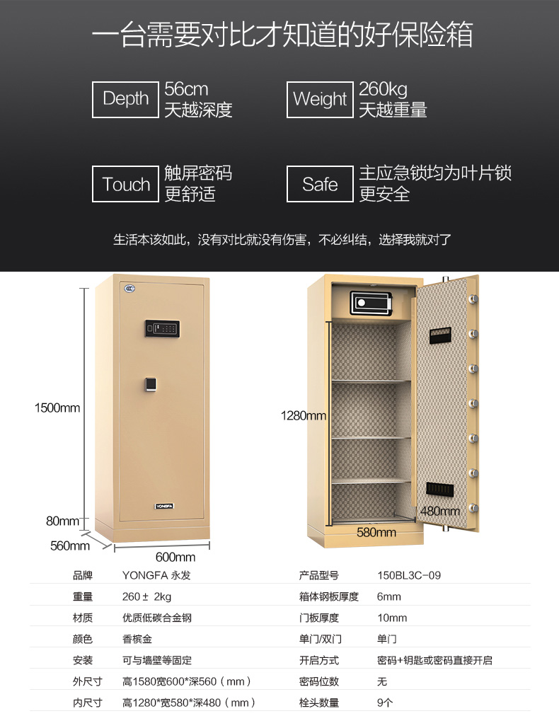 永發(fā)新品智瑞系列3C認(rèn)證電子式保險(xiǎn)柜150BL3C-09尺寸說明:1560高*600寬*560深mm(含底座) 重量:260kg