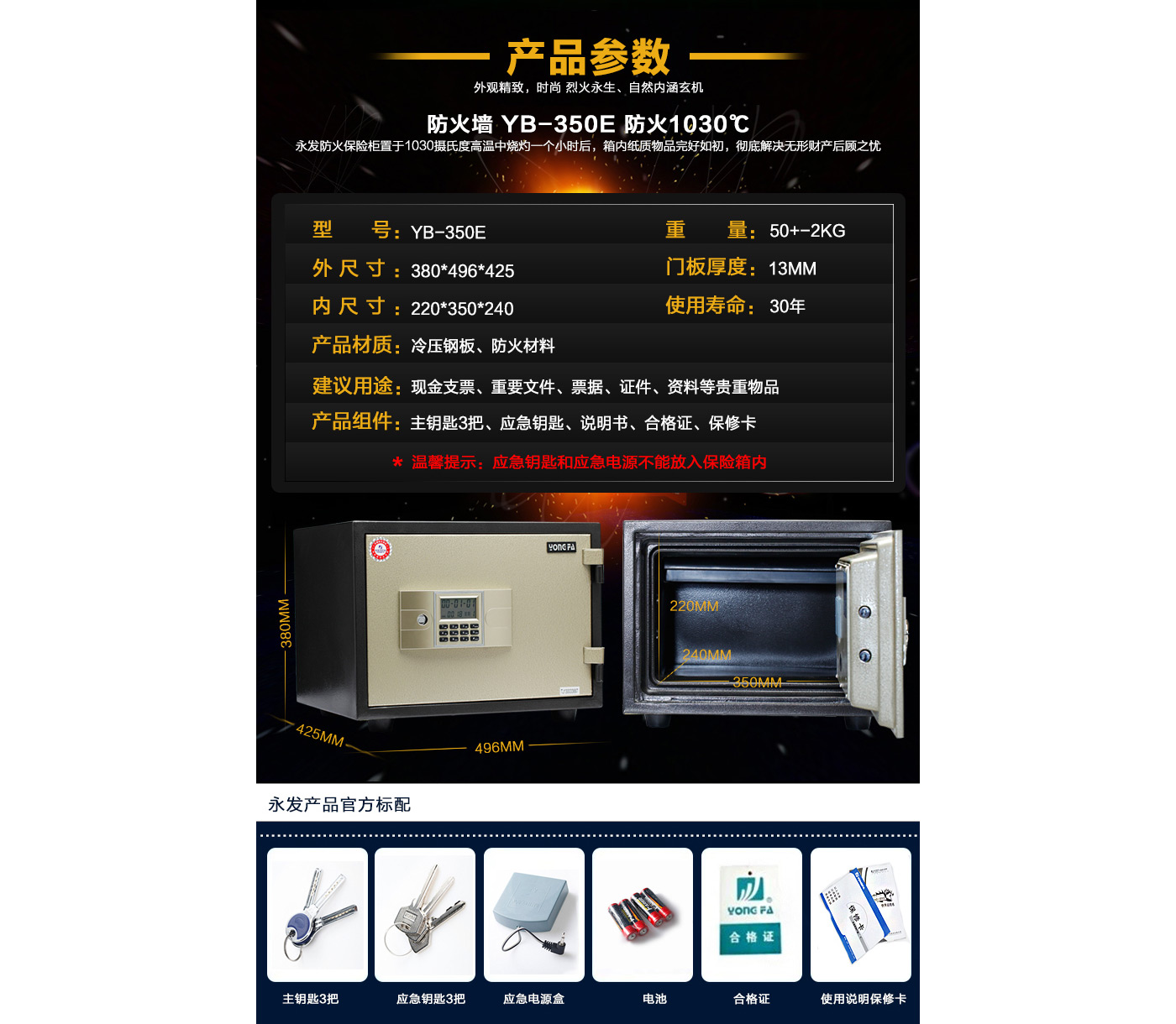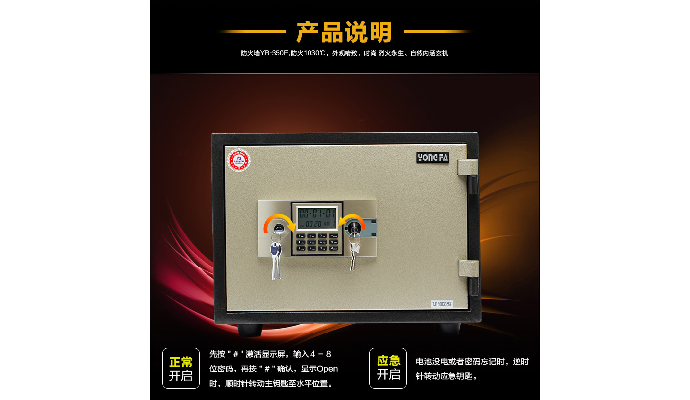 永發(fā)電子防火柜YB-350E尺寸說明:380高*496寬*425深mm 重量:50kg
