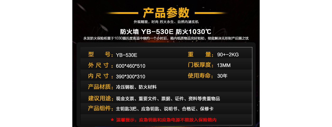 永發(fā)電子防火柜YB-530E尺寸說明:600高*460寬*510深mm(含底座) 重量:90kg