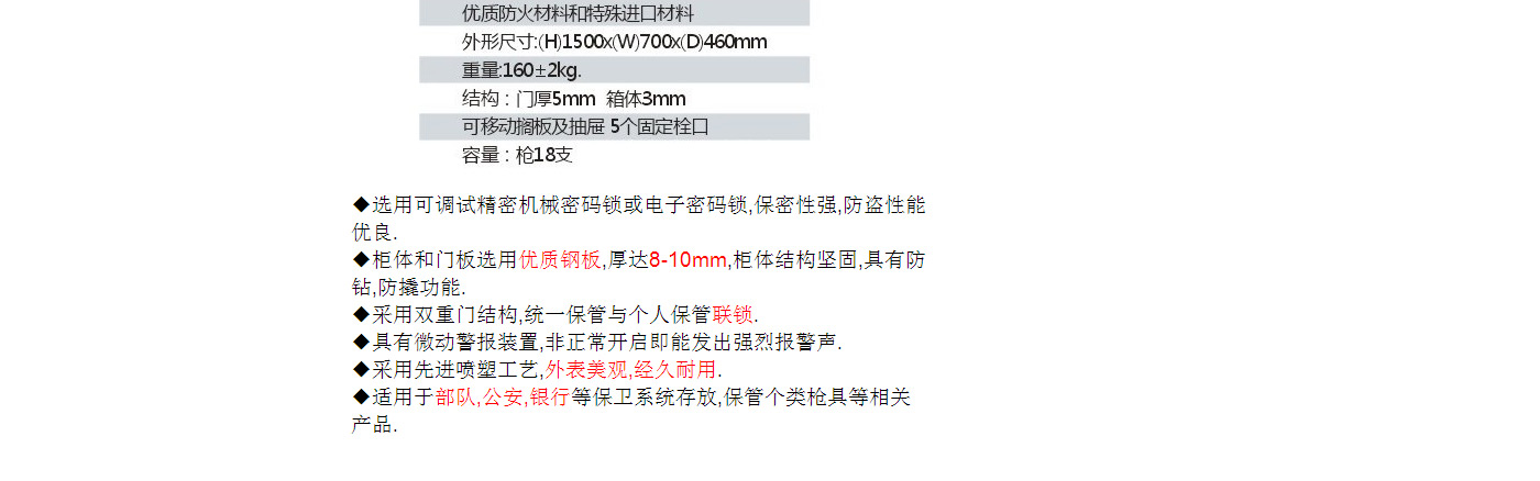 永發(fā)定制長槍柜尺寸說明:1500高*700寬*460深mm(含底座) 重量:160kg
