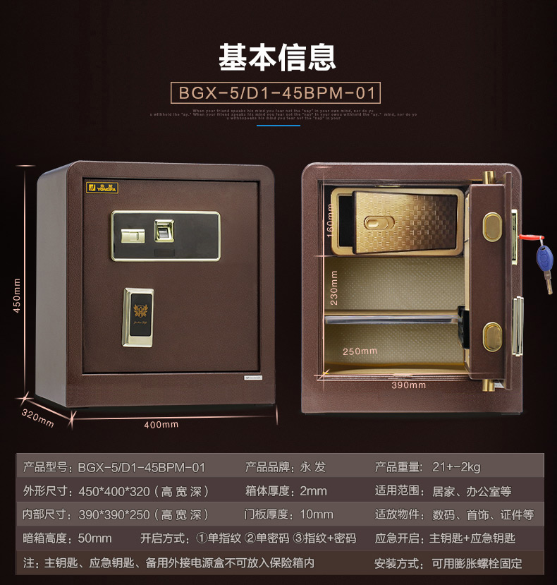 永發靈感指紋保管箱D-45BPM-01尺寸說明:450高*400寬*320深mm 重量:21kg