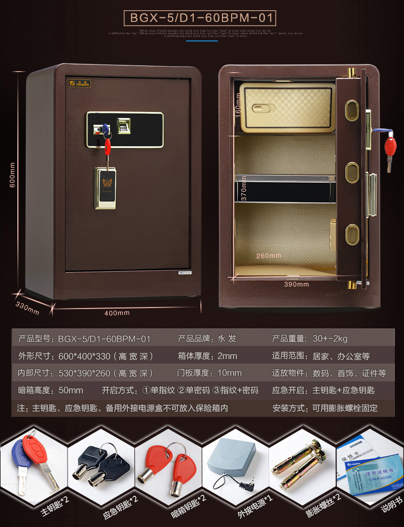 永發靈感指紋保管箱D-60BPM-01尺寸說明:600高*400寬*330深mm 重量:30kg