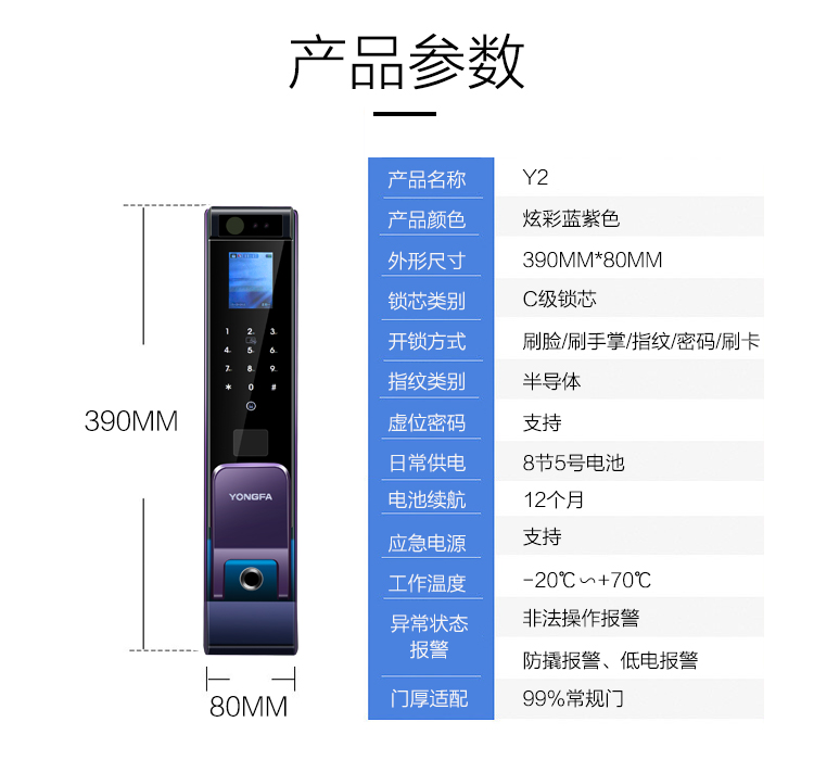 永發(fā)(YONGFA) 智能防盜門全自動人臉識別指紋鎖Y2尺寸說明: