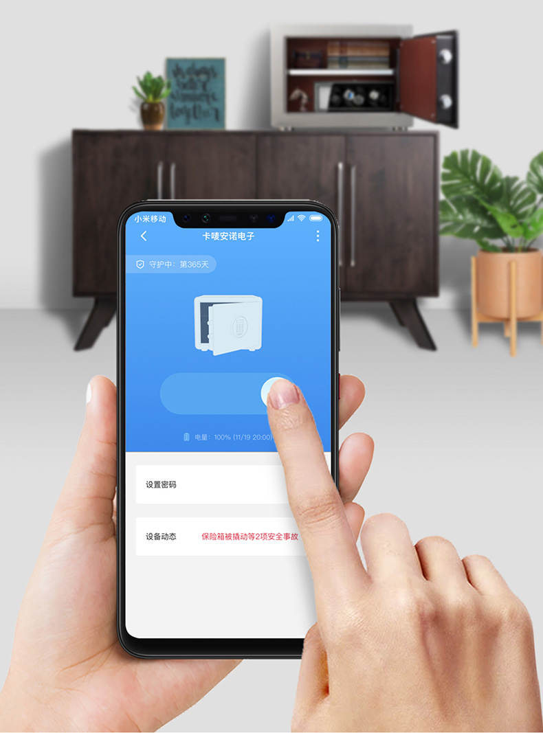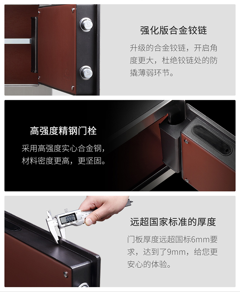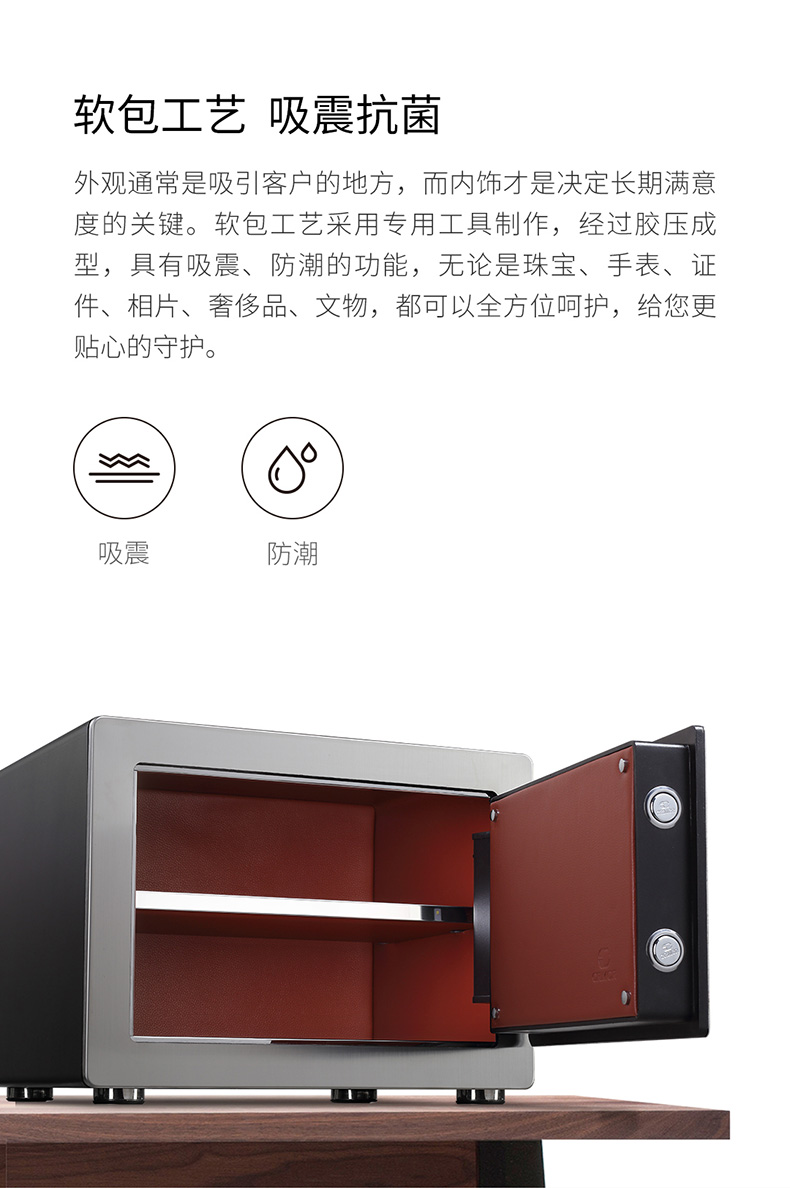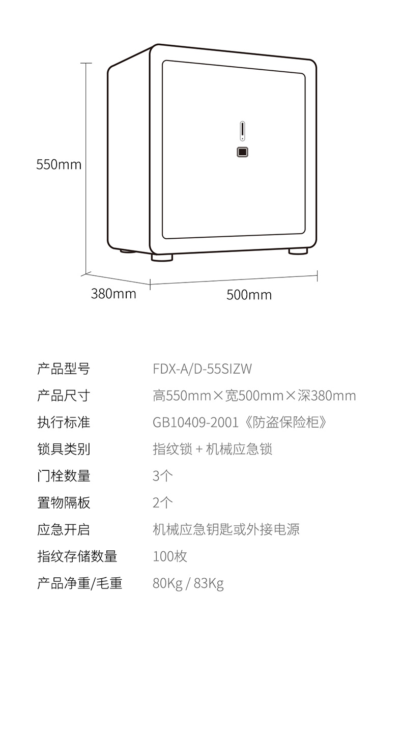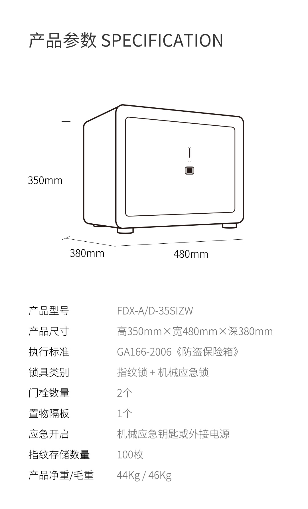 卡嘜安諾指紋系列3C認(rèn)證保險箱D-35SIZW尺寸說明:350高*480寬*380深mm(含底座) 重量:46kg